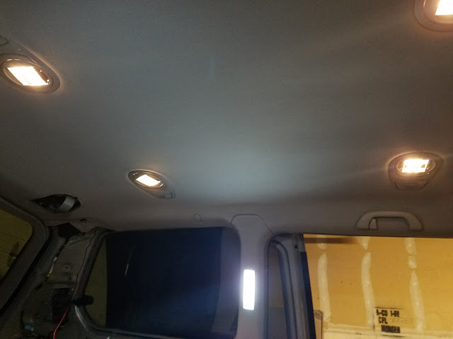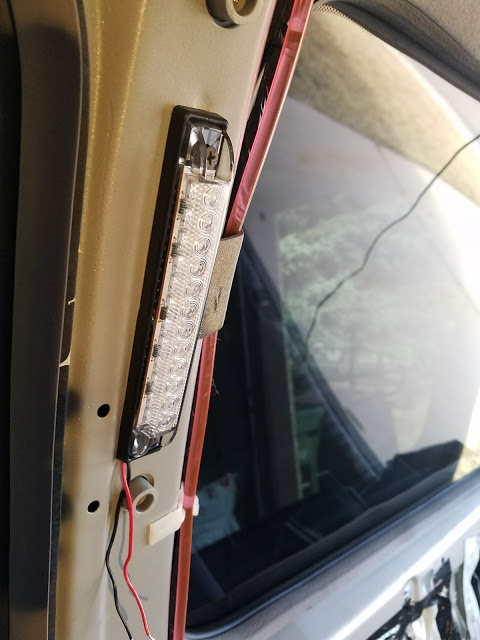 LED lights strips were installed where seat belts used to mount on the pillar between the rear quarter and the sliding door.