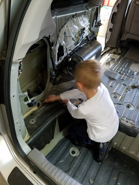 Quickly the demolition process started. Everything was ripped out from the front seats back. Here is my friends son Steele. Steele loved helping out an was a joy to have around during this project.