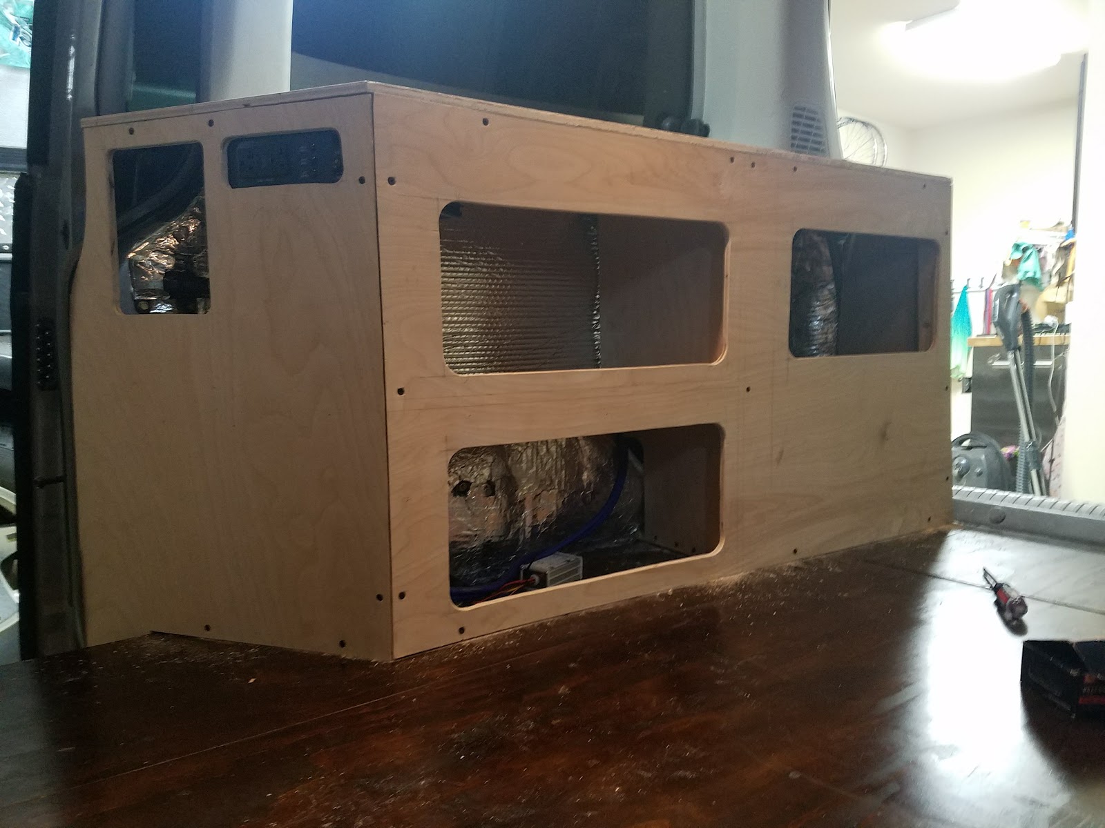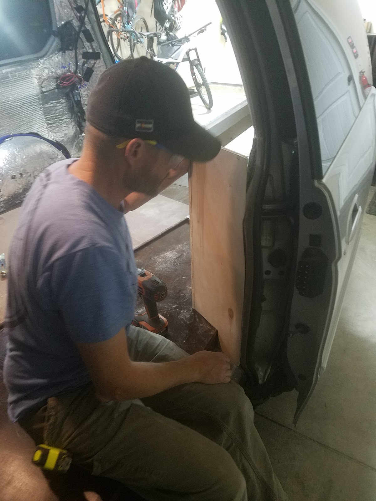 I took 3 months off from working on the van to focus on other things and camp in it a bit before making the finishing touches. Here is my friend Nick helping with the small cabinet on the driver side.