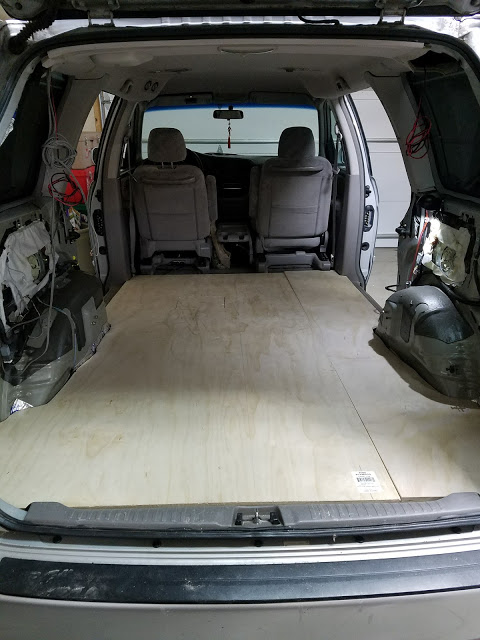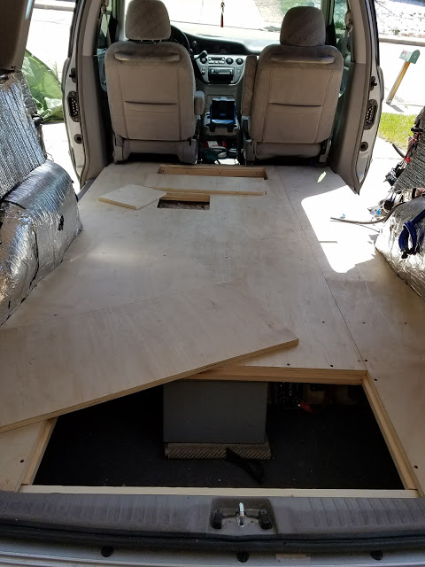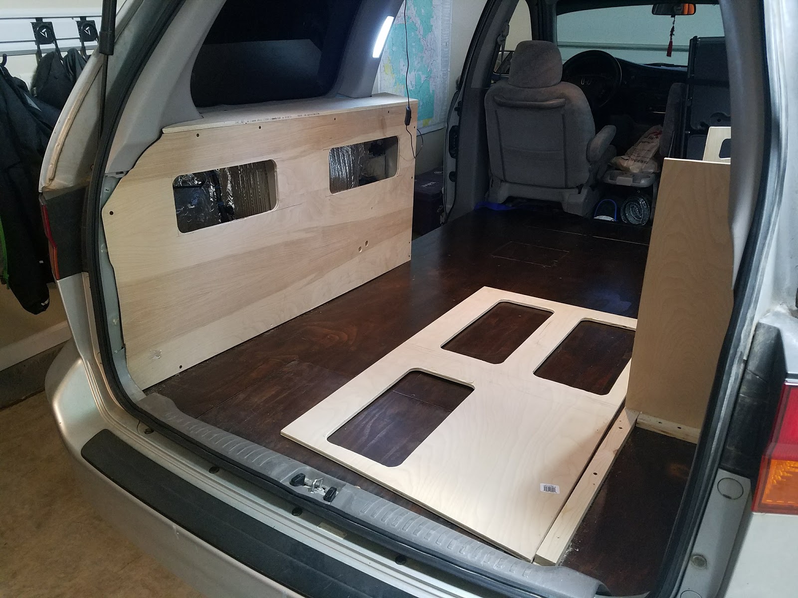 The floor was a HUGE project! After everything was removed from the back  there was an endless sea of uneven bumps, curves, nooks, and crannies. It took hours and hours of cutting, trimming, and sanding to get these large pieces to fit snugly and create a flat surface. Many nights at my friends Nick house were spent crafting this floor. Thanks again for your help Nick!