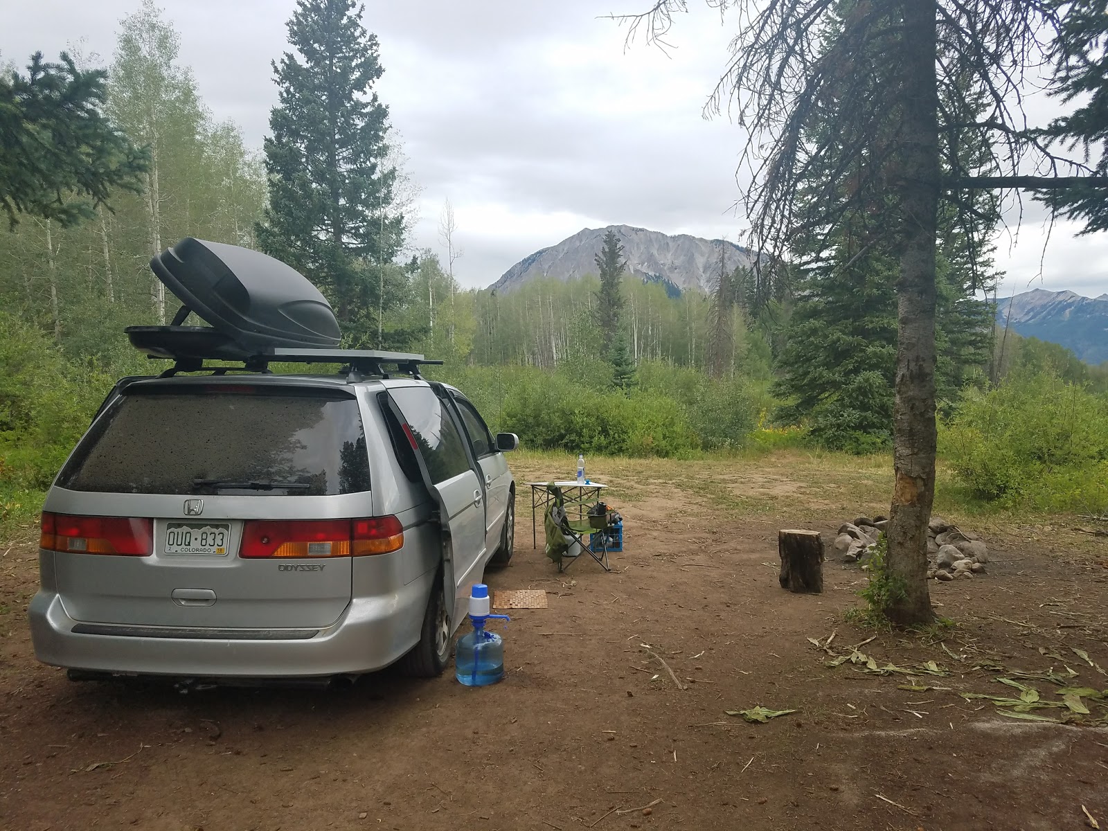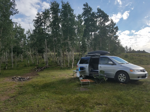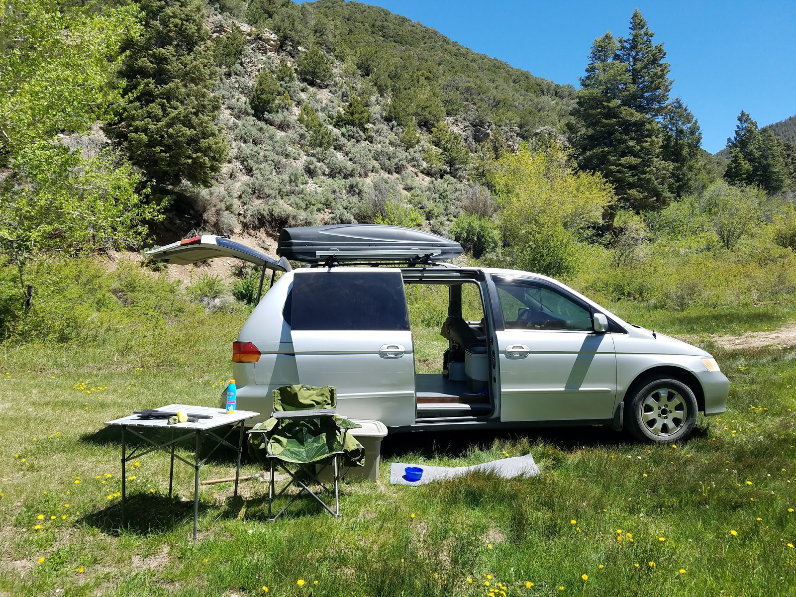 Beautiful free campsite outside of Buena Vista Colorado and the interior of my converted 2003 Honda Odyssey.