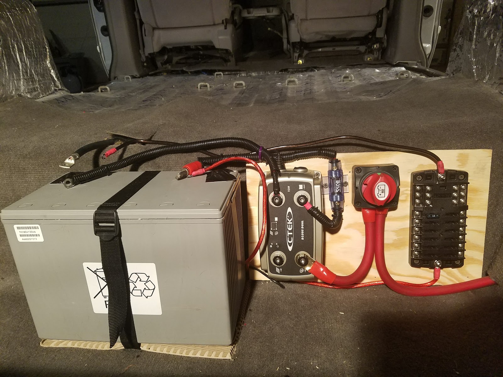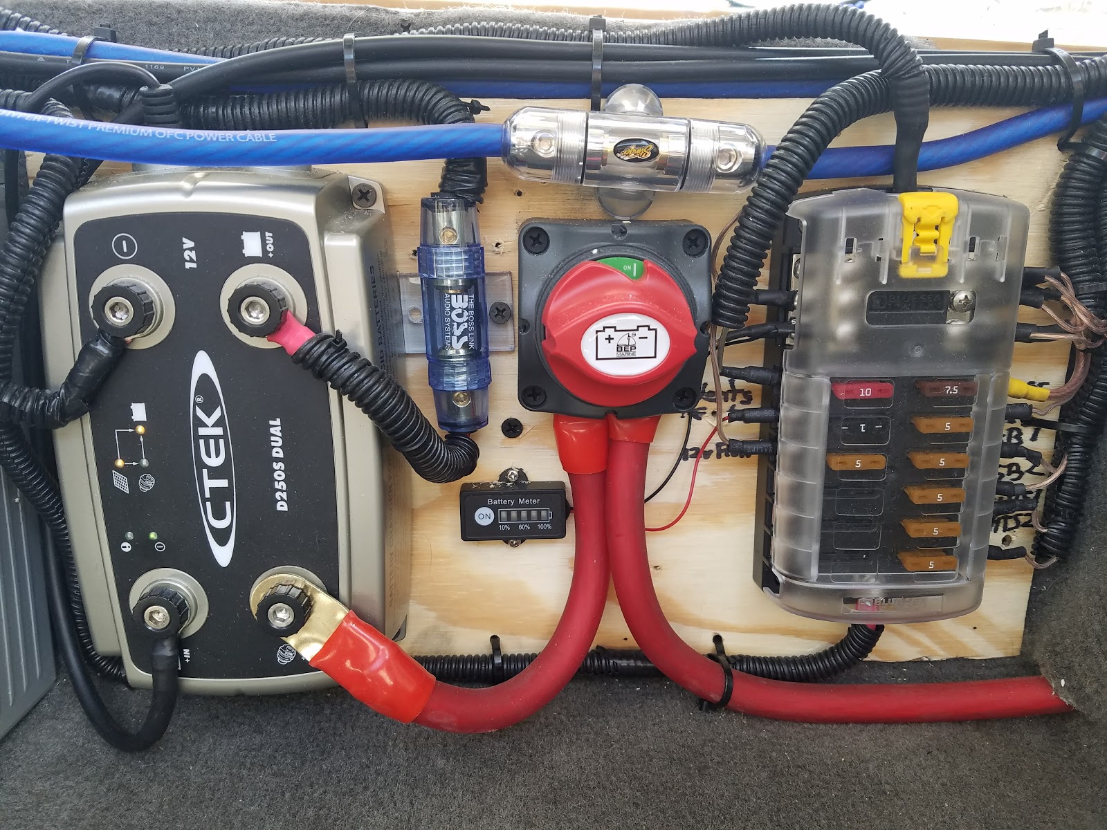 Here is a shot of the first stages of wiring the second battery system. I went with a CTEK Charge controller, and my friend Keith gave me a very nice AGM 12v battery. Next to the charge controller is a cut off switch to the front battery and then a fuse block. This system uses both the alternator and solar panel to keep the auxiliary battery charged. I had to run a 0 gauge wire all the way from the front battery to the rear of the vehicle. Let me tell you that was fun!