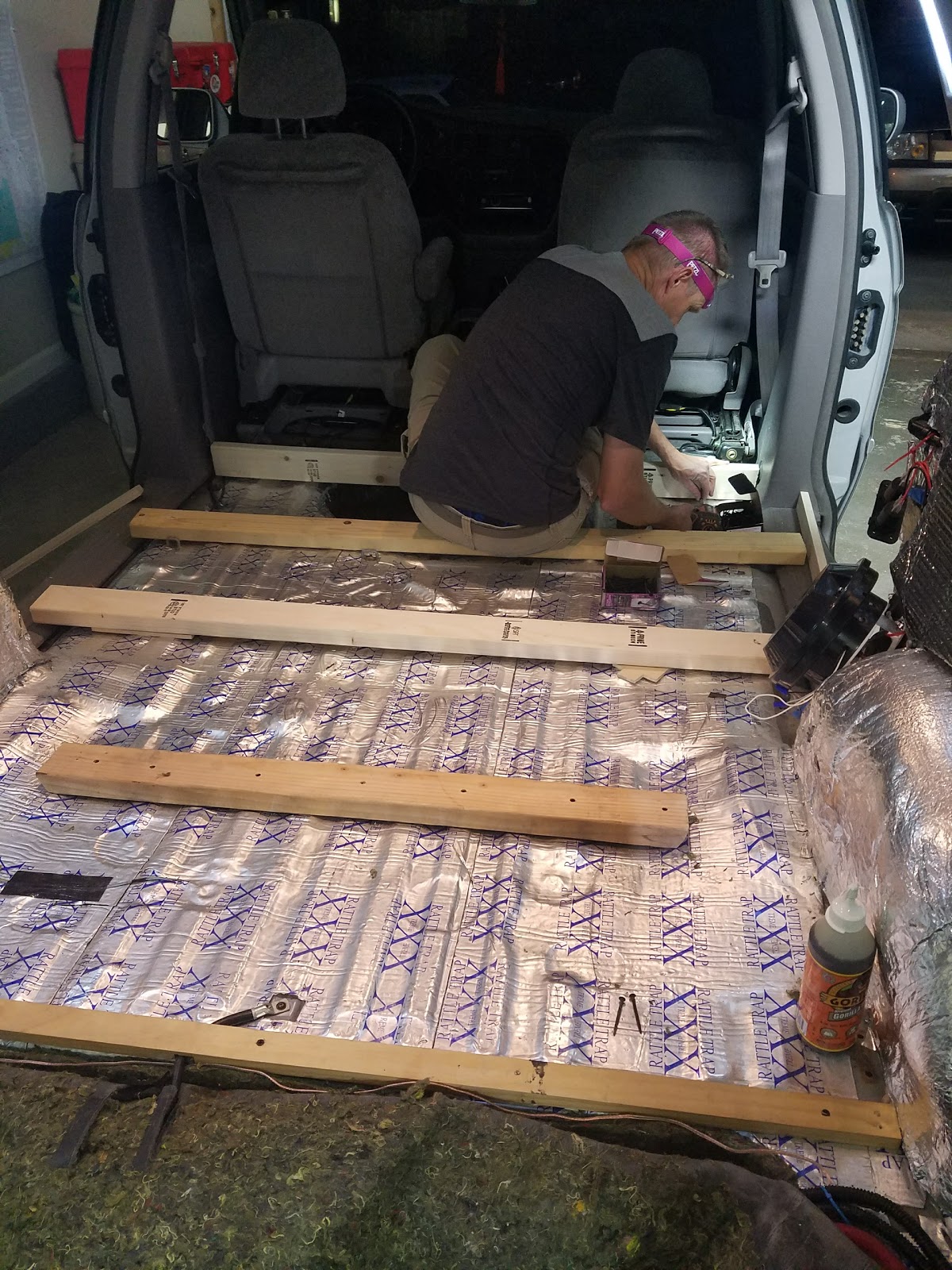 Nick and I are anchoring the braces and setting them at the right elevation for the wood floor to be secured. It is always nerve racking drilling screws into the sheet metal of your vehicle not knowing if there is a gas or brake line on the other side!