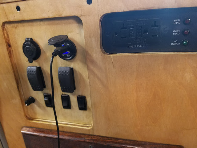Another shot of the switch panel, USB socket, 12v socket, and 600w pure sine wave power inverter.