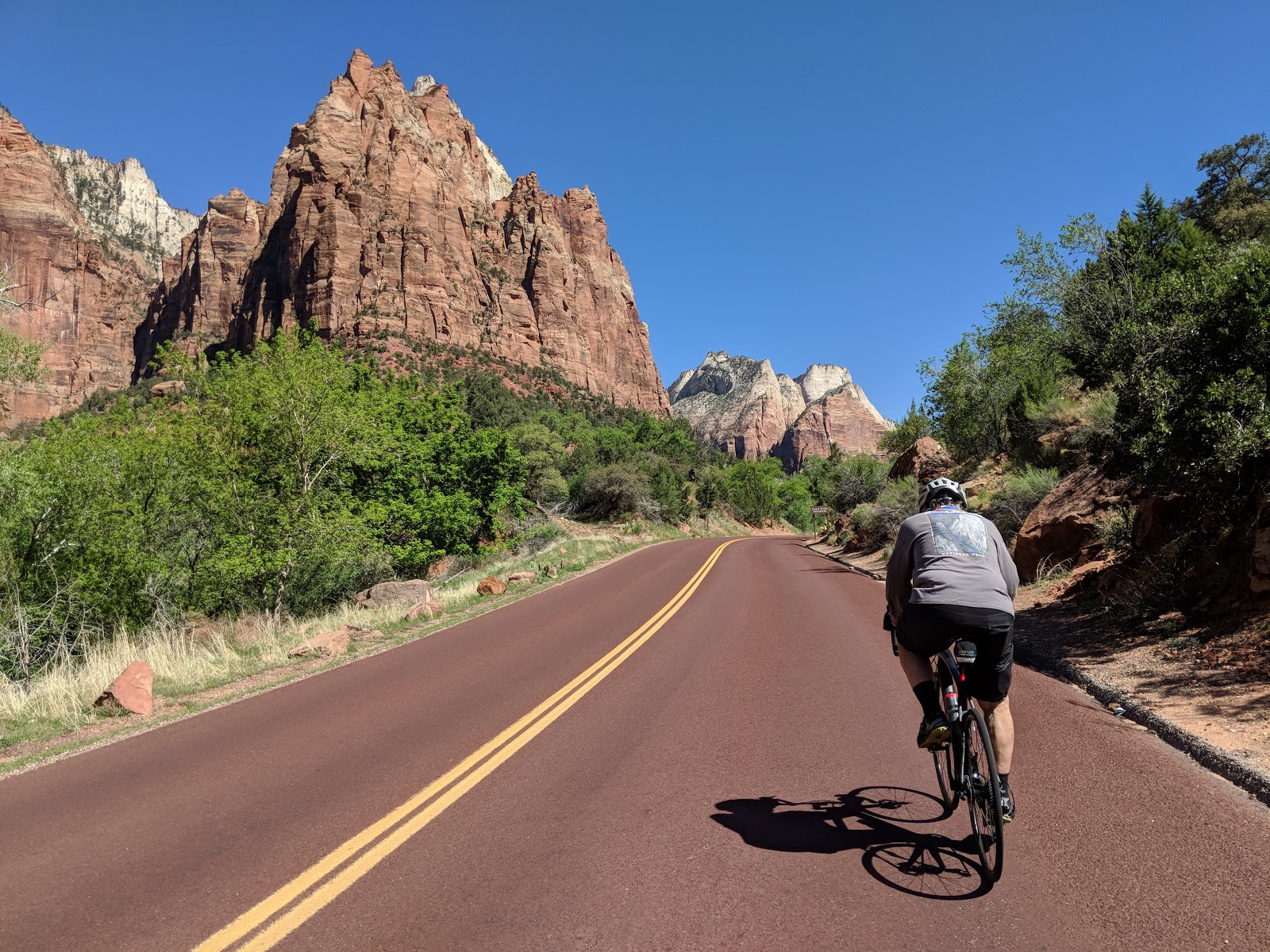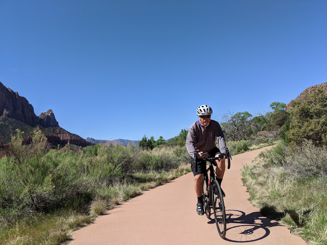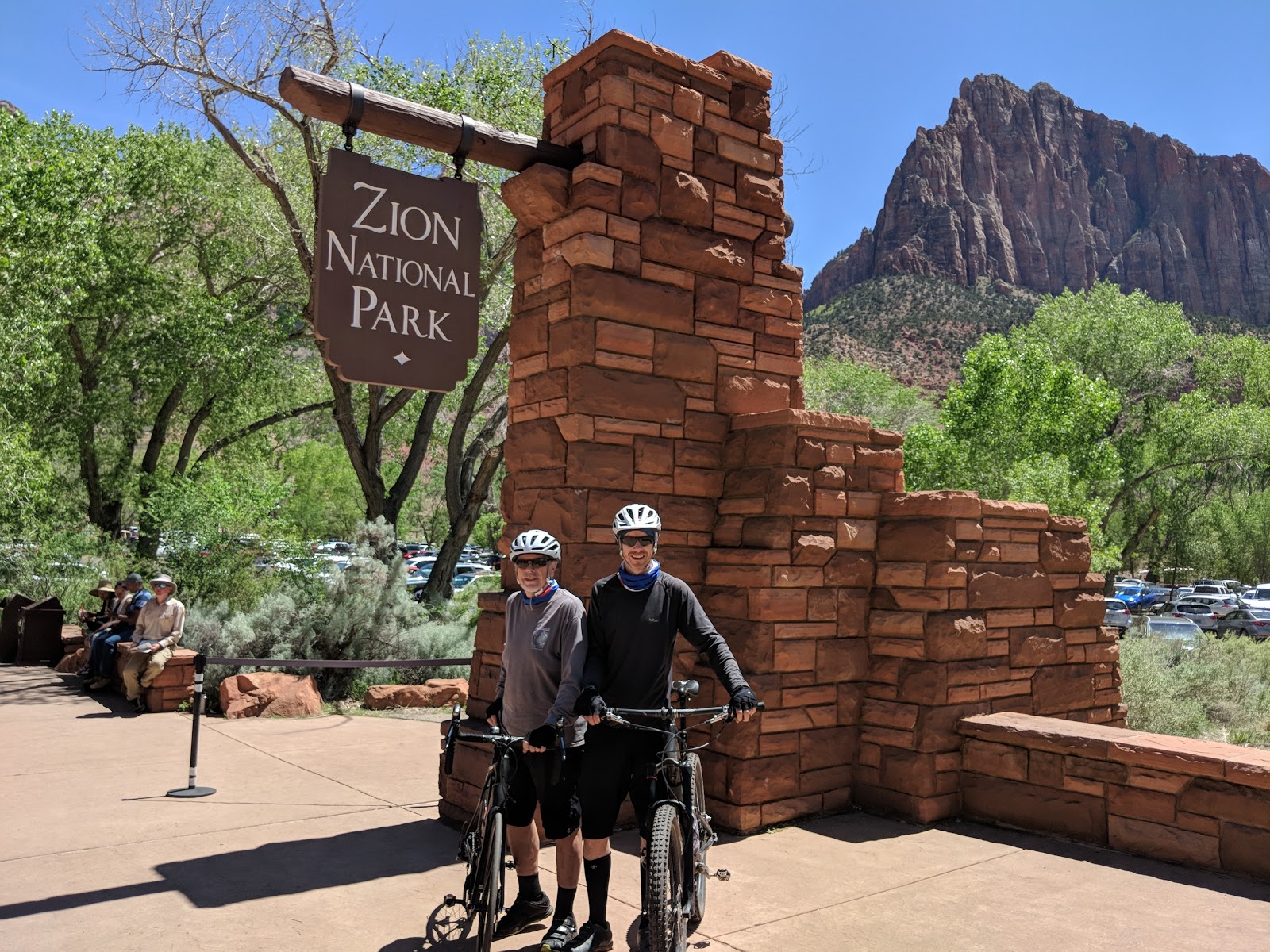 Here we are getting a father and son picture by the entrance of Zion. What a great ride this was. I left my cross bike at home and didn’t mind riding pavement on my MTB for this one.