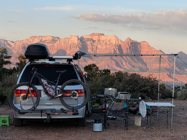 So after a few days of taking advantage of the camping at my dad’s RV park I wanted to get out for some more adventure. I made my way to Gooseberry Mesa and found this amazing camp spot right on the North ridge of the Mesa. I was one of the best camping spots I had so far. Amazing views, seclusion, and amazing trails just yards from my camp. Click on this panorama and check it out full size!