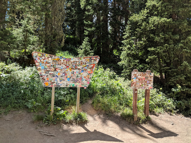 So after taking a rest day it was time to ride the trail that Crested Butte is famous for. The 401 trail!. Here I am completing the road climb to the top of Schofield Pass. I thought the massive amount of stickers covering this National Forest sign indicating the top of the pass was interesting.