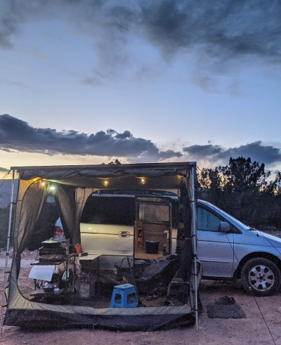 Here is my new and improved camper setup. I sold my sold my 6’x8′ awning and went all out for ARBs 8’x8′ awning and Deluxe Room. ARBs Deluxe Room is outstanding! It’s a fully enclosed room that can be converted from fully enclosed, screened, or open. In addition to the massive living space I can now cook and relax protected from the wind, rain, and bugs. I also purchased a separate small solar system to supplement the main solar system integrated into my van build. Then I set out to find the most baller camp chair I could find.