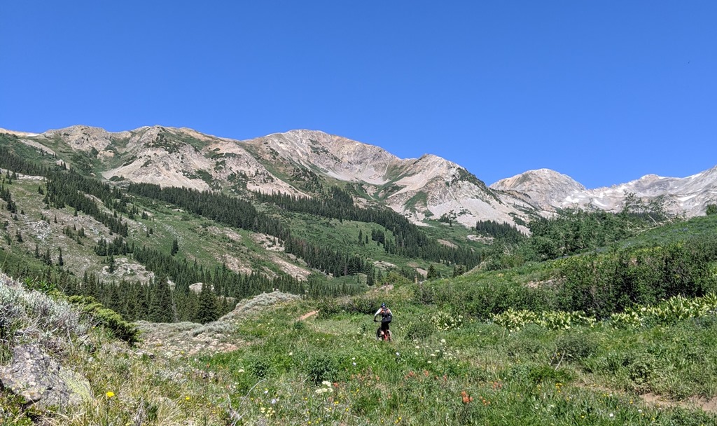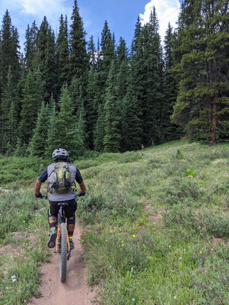 Climbing is tough getting up the start of the singletrack on the way to the top of Teocalli Ridge.In 2018 I got my ass kicked on this trail. It was my first high elevation ride of the year and I bonked so hard I could not enjoy the downhill. After getting rested up from the 195 mile ride with Joe and Kristen I was feeling pretty strong and ready for another attempt.