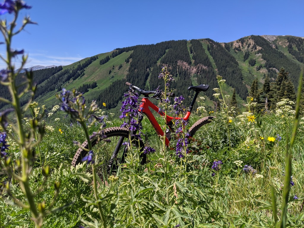 The wild flowers were poppin! I was feeling strong at this point but there were still some steep spots that required you to push your bike. About 2/3 of the way up I was pushing my bike, huffing and puffing and I look back and see a middle aged couple rocketing up the climb that I could barely walk. They zip past me and say hi, I notice a whirring sound that reminded me of and RC motor. Ha! They were on e-bikes! Ok my spirit wasn’t completely crushed after all.