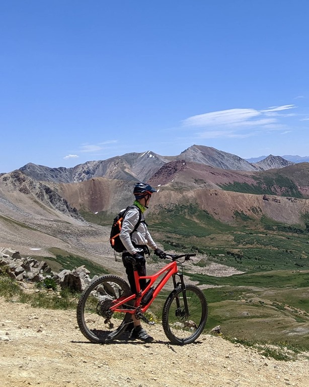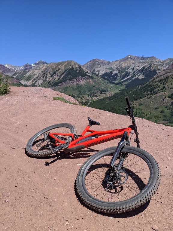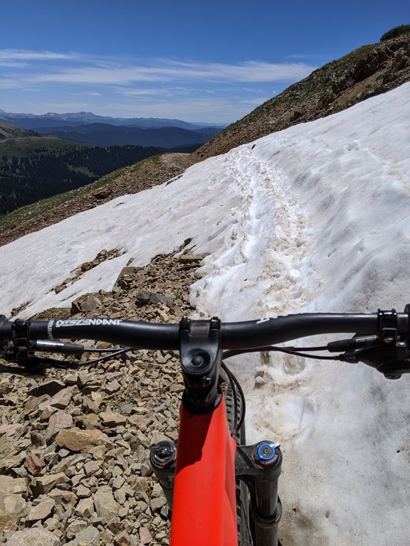 I wasn’t riding to the town of Aspen but still wanted to make it to the top of the 12,705 foot pass then head back to camp. On the way up I ran into some jeepers and had a good conversation with a gal that was waiting for her husband and friends to get to the top and head back. One of the jeeps radioed in and said they had to turn around about 200 yards from the summit due to a snow bank. When I got up there and saw it for myself the snow bank looked manageable so I drug my bike across the off camber snow bank. Briefly after getting back on dry trail I encountered another snow bank that was just as easy to cross as the last one.