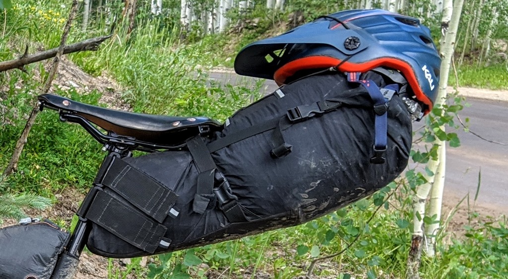 The larger SeatPak’s performance is incredible when riding loaded. My seat pack is a few years old had is just as sturdy as the day I bought it. Some of my favorite innovations are the oversized straps and buckles used to keep this large bag snug and your gear compressed. In the above picture my pack is filled to the brim. I rely on mine to hold my shelter, 10 degree sleeping bag, and rain gear. That’s a lot of stuff!. My JPaks Seatpak fits securely with 2 over built velcro tabs around the seat post then two heavy duty straps with locking buckles that attach to my seat rails. This plus some plastic molding in the front of the pack makes for easy loading. After my gear is stuffed inside I use a velcro enclosure at the edge of the bag and compression straps to roll and compress its contents. What I end up with, if properly packed, is a very stable bag that holds my gear securely all day long despite how rough the ride gets. There is minimal sway and my legs or butt do not rub against the material when peddling. I have been extremely happy with this pack and has proven to be an essential piece of my bikepacking gear.