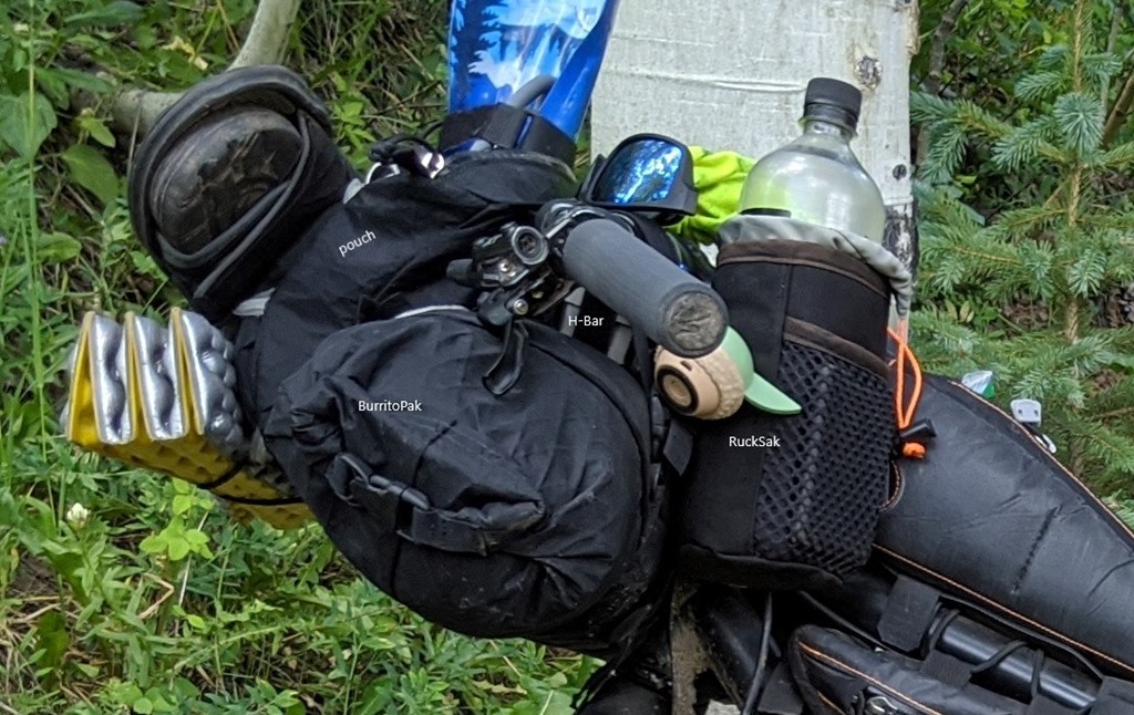 Bags from left to right..The Pouch, BarritoPak, and RukSak all work in harmony to securely load gear onto the front of your bike. In the picture above is my JPaks Deluxe H-Bar Pak setup with the BarritoPak and the handy Pouch that for the front. With all my gear fully packed I find minimal impact with steering and the load feels nicely balanced and secure on the front of my bike. The BarritoPak is the largest bag in the grouping and is the one that looks like a burrito. Each end is equipped with a velcro and buckle and roll system that allows you to compress your gear. The cleverly designed “H” mounts space the bag away enough from your bars to clear your cables and levers. I typically will strap this bag on loosely then use a piece of gear like an air mattress or sit pad to create structure in the middle. Then fill the rest with food on one side and clothing on the other opening. After compressing each end you should have a nice burrito shape. Joe makes an additional pouch that is designed to mount to the front of the “barrito” and offers quick access for items like my stove, food, medical kit, and more. It takes some practice to pack and get the straps right but when done correctly I am left with an all day long secure fit.
