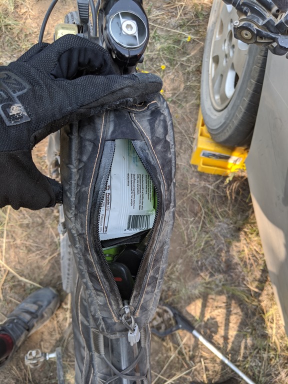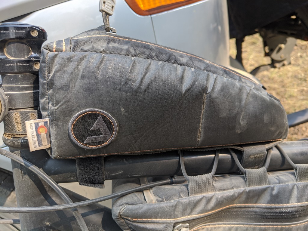 My ToolPak fits snugly into this corner of my bike and is filled with bike tools, spare parts, a small bottle of chain lube, and enough room left for my headlamp.