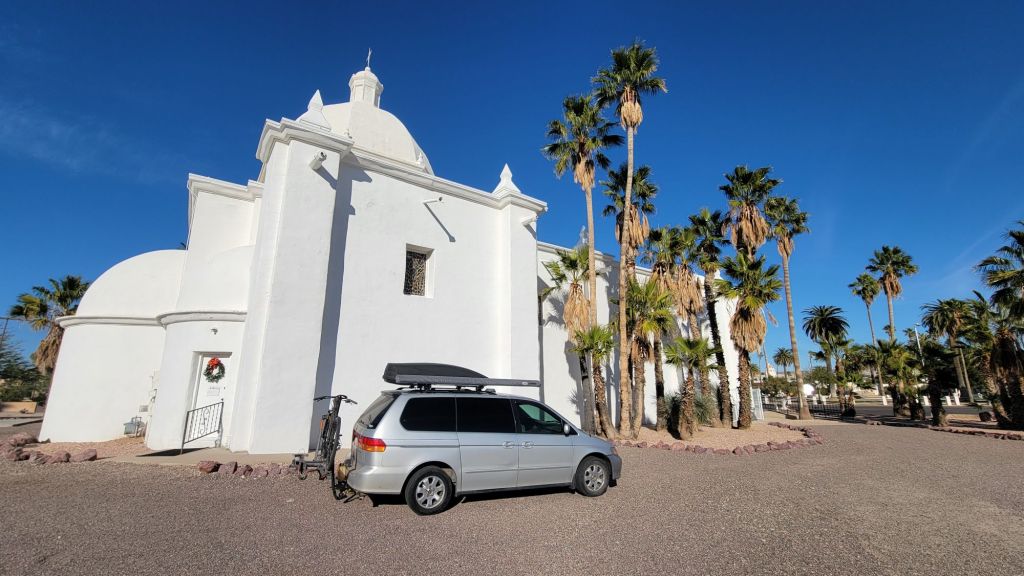 You’ve gotta stop by the iconic church in downtown Ajo… Immaculate Conception Church really sets the vibe. It’s the kind of place that instantly slows you down… white stucco glowing in the desert sun, palm trees swaying, and that quiet, timeless energy that makes Ajo feel like more than just a stop… it feels like a place.