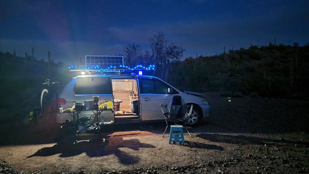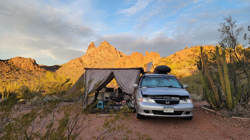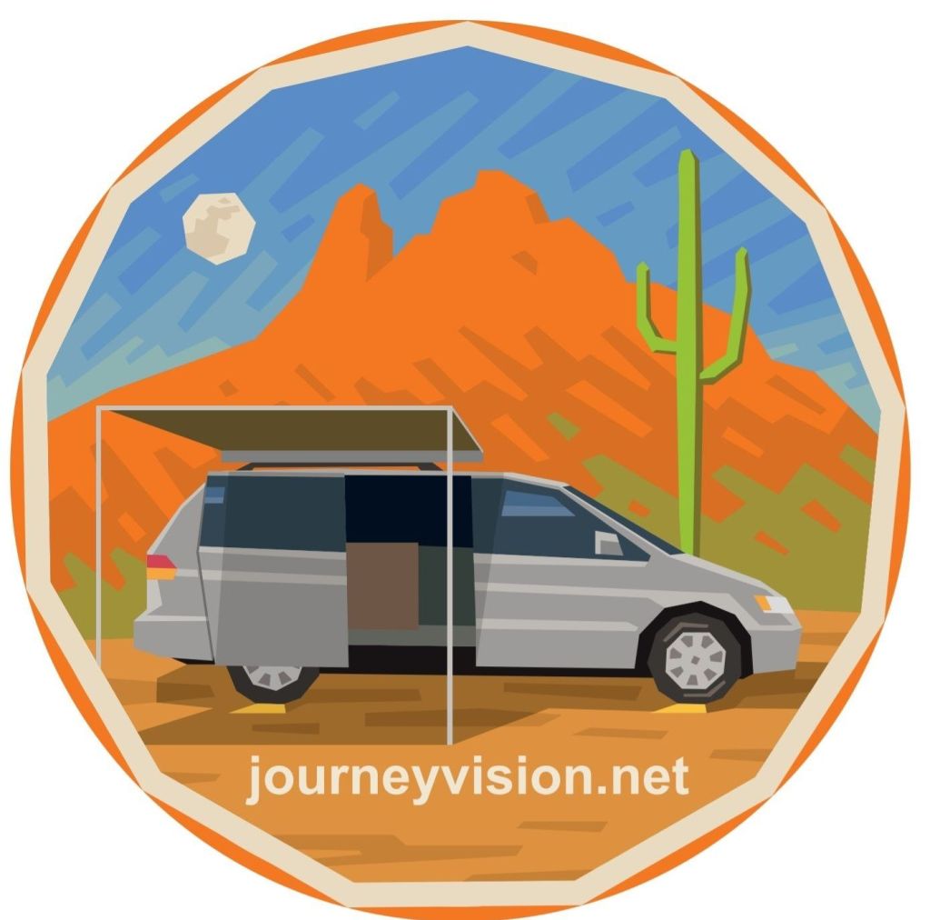 Here’s a shot of my iconic campsite… the full spread of gear set up. You’ll notice the little side room off my minivan camper… my own extra bit of space out here in the desert. But this spot… this right here… is what inspired the logo for journeyvision.